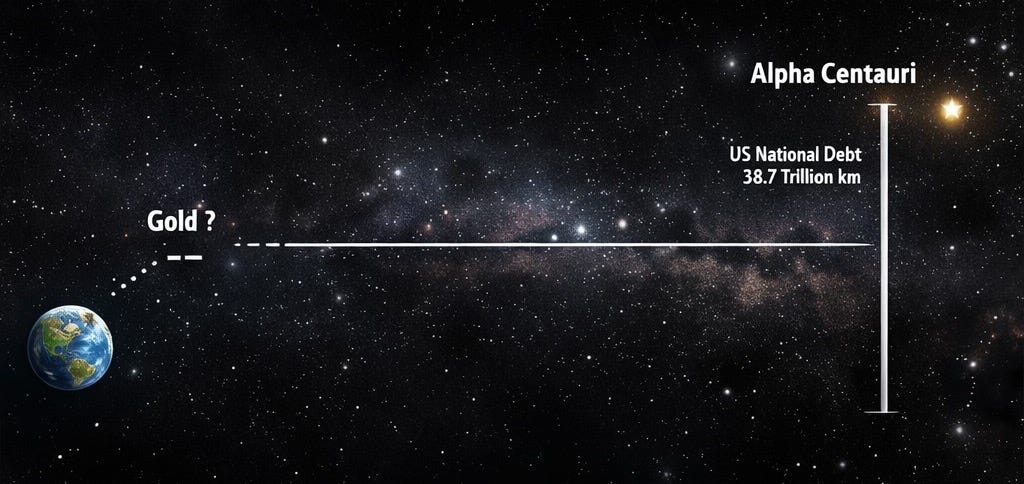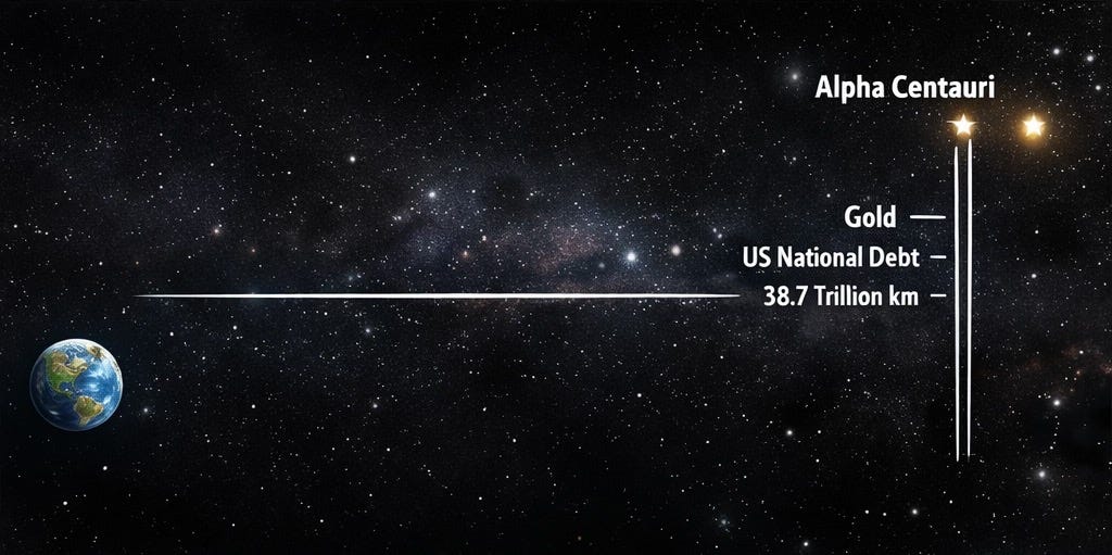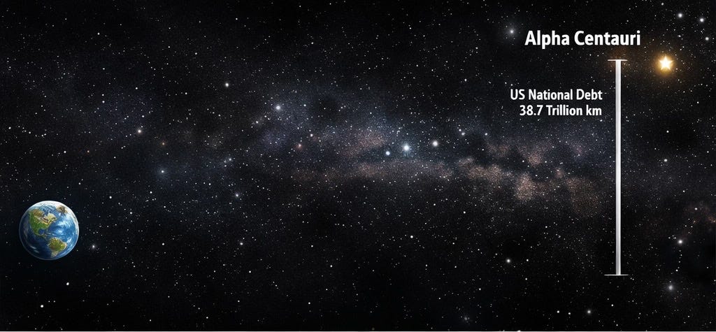 If every dollar of US federal debt were a kilometre, the resulting line would stretch roughly 38.7 trillion kilometres. That distance takes you almost exactly to Alpha Centauri, four light years away, the nearest star system beyond our own. Not the edge of the solar system. Not the orbit of Pluto. Another star.